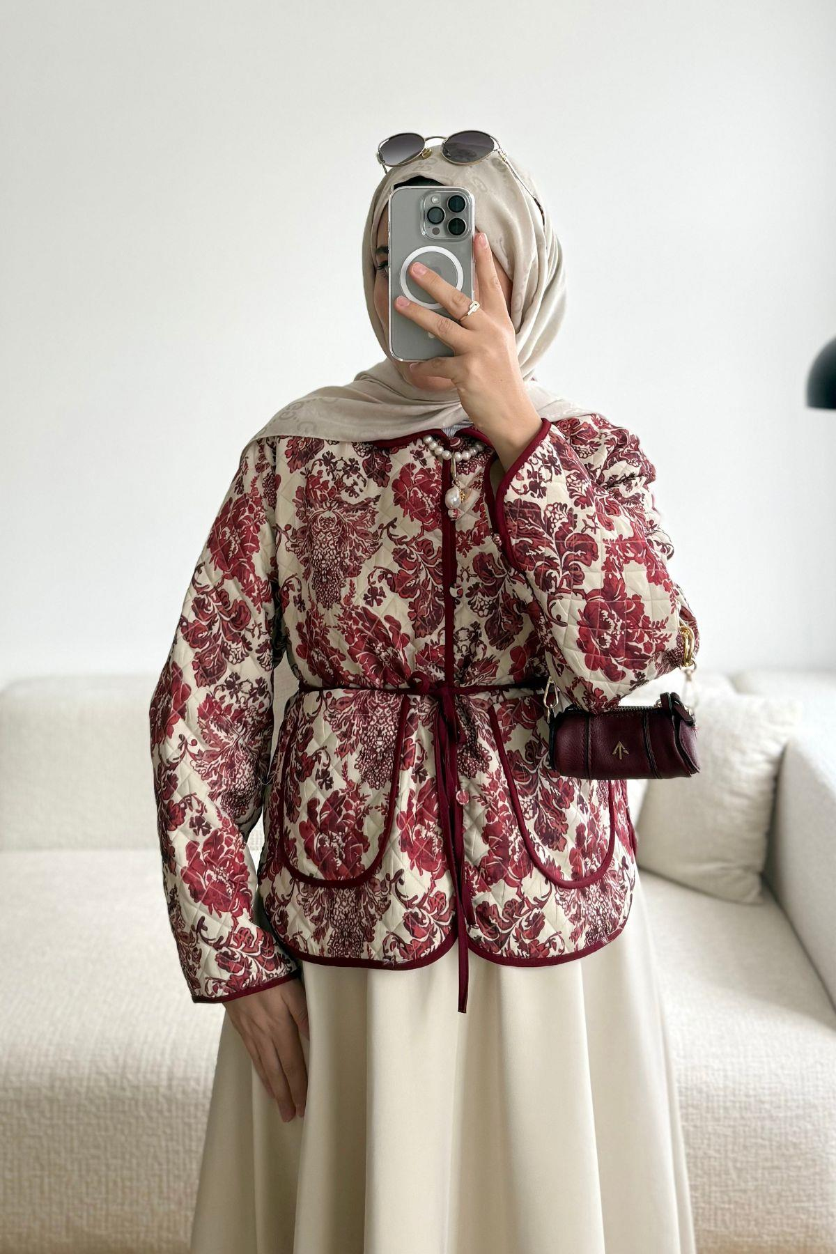 BORDO ÇİÇEKLİ KUŞAKLI KAPİTONE CEKET
