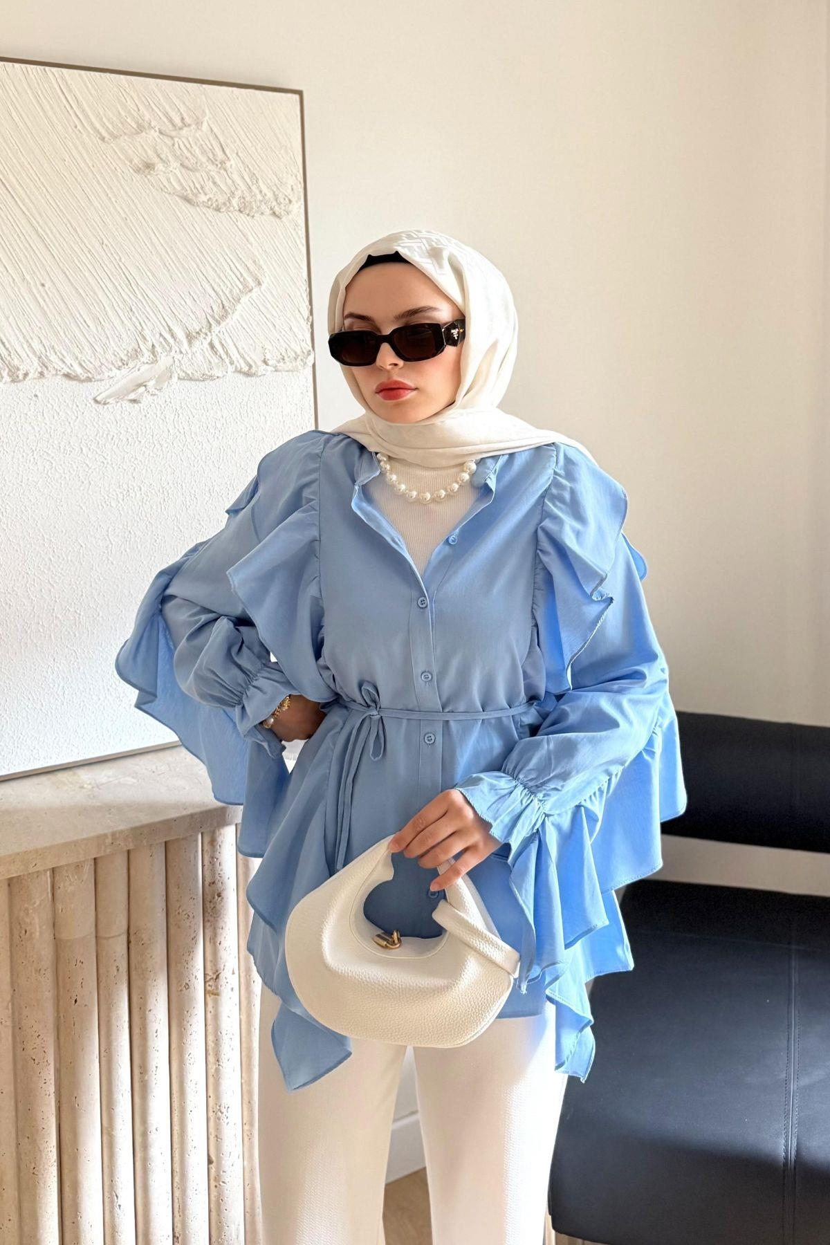 MAVİ VOLANLI KUŞAKLI GÖMLEK