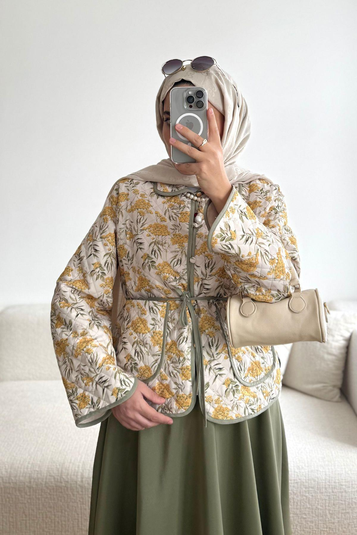 SARI ÇİÇEKLİ KUŞAKLI KAPİTONE CEKET