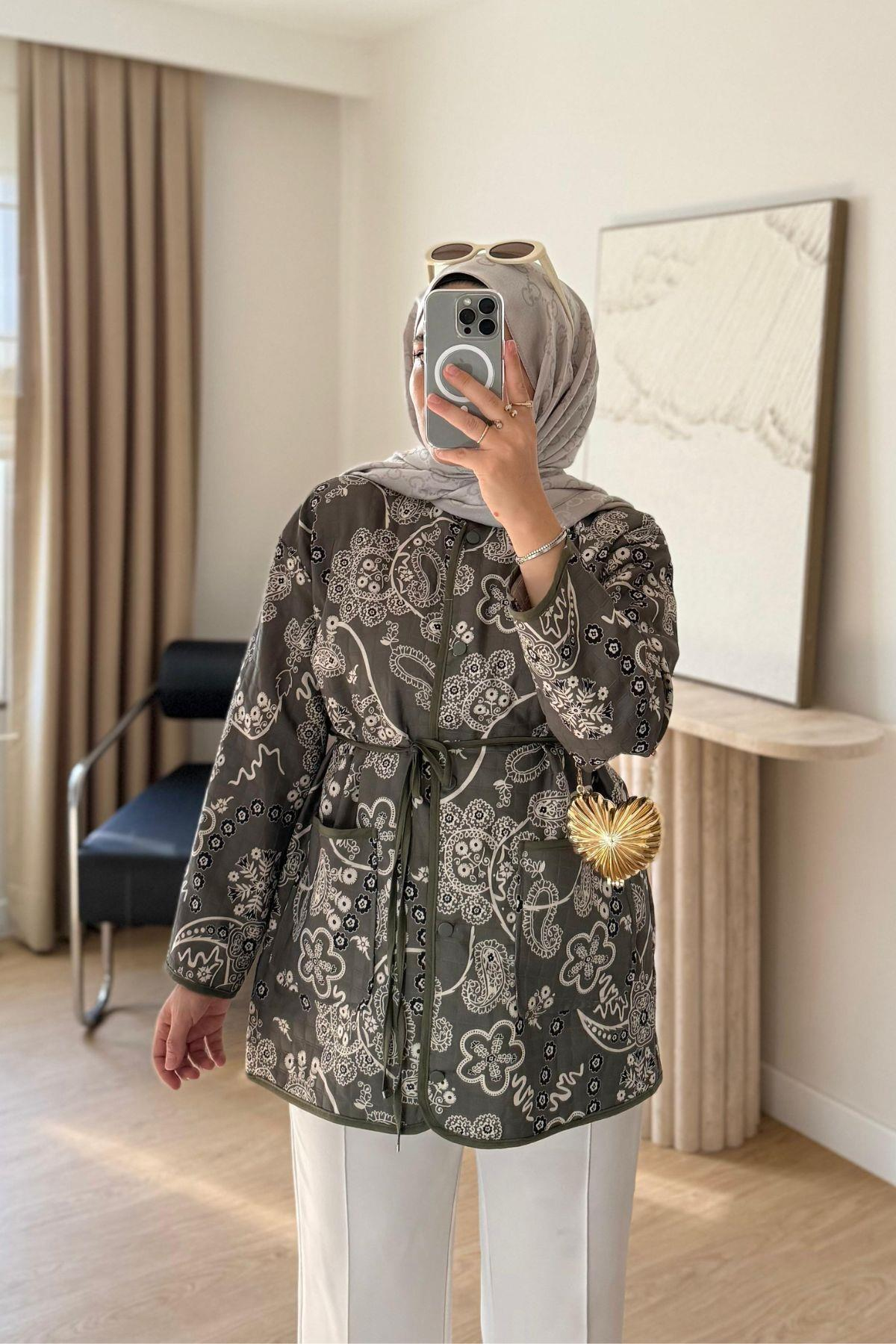 SOFT YEŞİL ETNİK DESENLİ KUŞAKLI CEKET