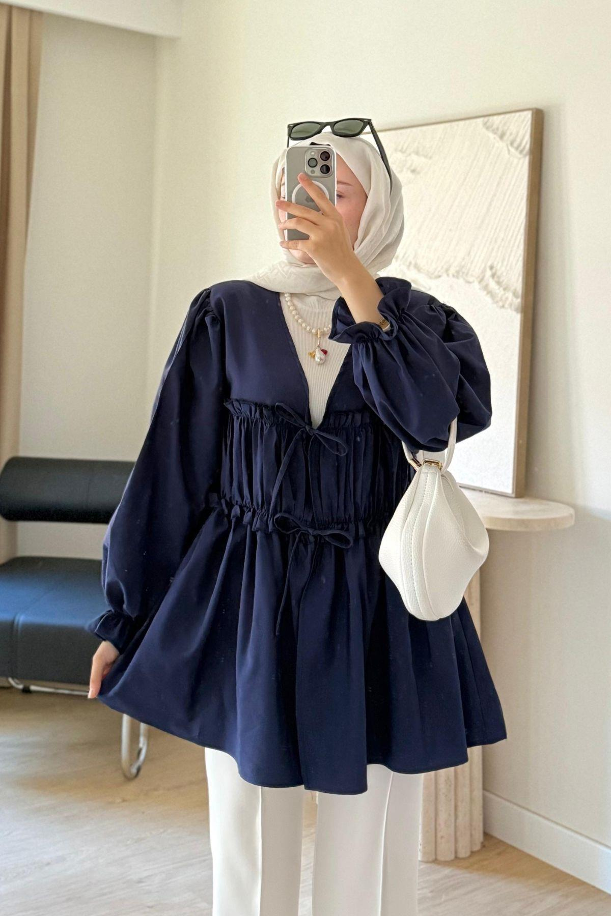 TİLYA LACİVERT TASARIM BÜZGÜ DETAYLI GÖMLEK KİMONO